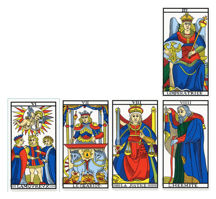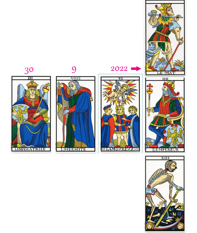 În acest interval de timp, din perspectiva Tarotului de Marseille, se va resimți la cote maxime suprapunerea UNICĂ și extravagantă de arcane din acest an aflat sub puternica influență numerologică a frecvenței lui IIII dar și a lui VI: Împăratul IIII, Marte în Gemeni retrograd, Arcana fără nume XIII, NS din Scorpion și Nebunaticul 22, toate înSCRISE în CIRCuitul de viteză în COASTĂ a Îndrăgostitului eMOTIV.