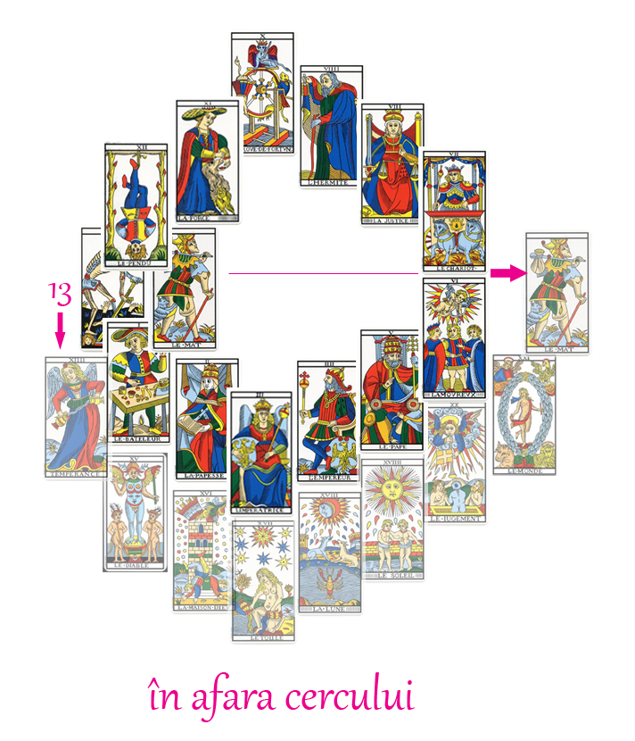 În afara cercului celor 12 luni repetitive ale ANUlui, ATUNCI CÂND ARCANA FĂRĂ NUME NU O IA ÎNAPOI CA UN NEBUN INCONȘTIENT DE LIBERTATEA LUI (ca și acela din versiunea de Tarot RWS), ridicarea în conștiință ar începe de la arcana XIIII a Temperanței, cu un Împărat IIII ieșit de sub Roata Fortunei X și s-ar încheia cu o Lume XXI ieșită din labirint, trezită spiritual și liberă de destin! Sub acest aspect, data de 13.12.22 (4-12/3-4) ar putea fi o asemenea răscruce temporală în care arcana fără nume să-și poată depăși blocajul de Nebun, să-și elibereze Împăratul prin TEMPERANȚĂ, în loc să meargă la război, să se reunească și să renască împreună cu draga lui Împărăteasă. Deci, dragi avatari Împărați, de peste tot din LUME, oriunde v-ați afla, și de asemenea din FIECARE dintre NOI, fiți cu ochii în 4 (!!!) la acea zi pe care ar fi bine să o MARcaȚI cu ROȘU în calendar! CĂCI DA, VA FI ÎNTR-O MARȚI, în care Soarele va lumina, desigur, tocmai arcana ispititoare a Diavolului! Acela ar putea fi un punct de ieșire sau dimpotrivă, de reîntoarcere în circuitul fatal, pentru că peste încă 9 zile de incubație, pe 22.12.22, o lume PERSONALĂ nouă s-ar putea naște cu un Nebun Îndrăgostit de libertate și dornic să exploreze și alte dimensiuni, aflate înafara cercului infernal de foc, de suferință.