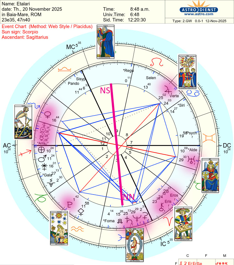 Luna nouă a Scorpionului are loc în ziua Judecății, 20, la orele Justiței 8 și minutele Spânzuratului, 48/12, anticipând tranziția nodurilor de destin pe perechea de arcane Justiția la NS – Judecata la NN.