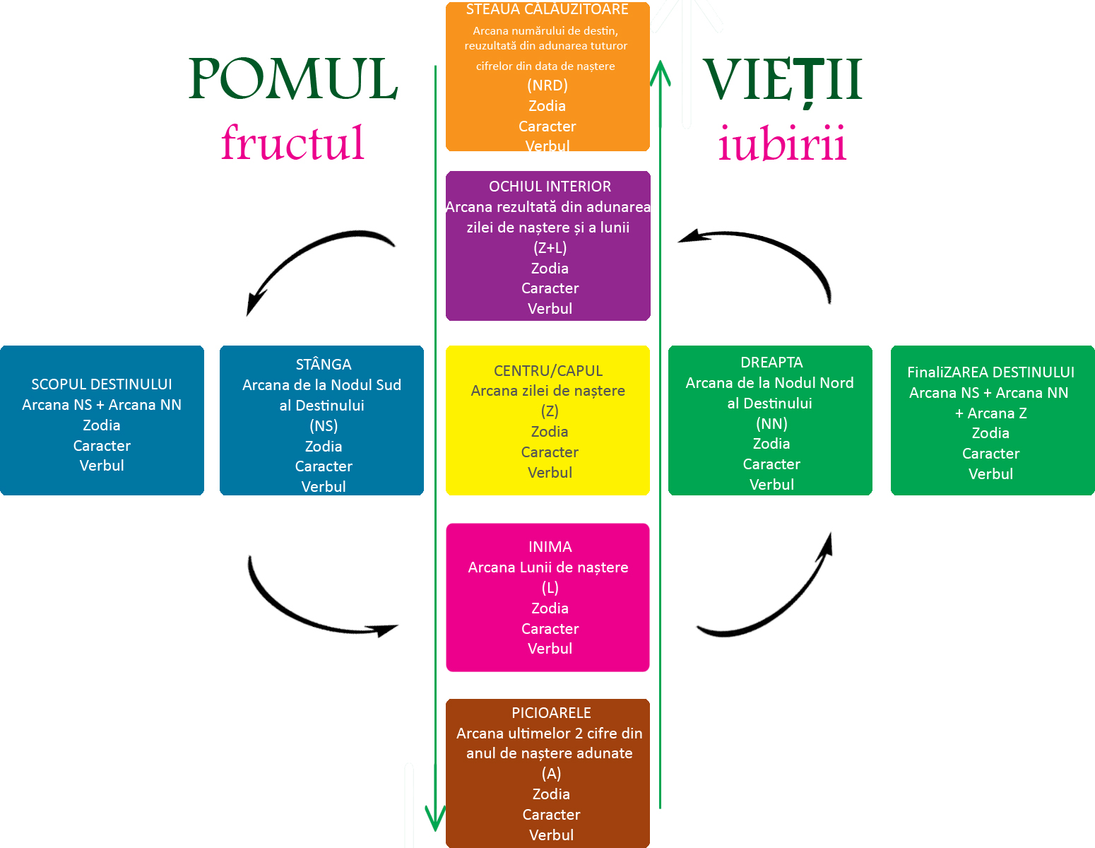 POMUL VIEȚII este orientat pe verticală ca un trunchi ce crește din pământ și urcă spre cer iar pe orizontală are 2 ramuri principale, de la trecutul cunoscut ca o moștenire transpersonală (NS, stânga) spre viitorul necunoscut ca o acumulare experimentală (NN, dreapta).